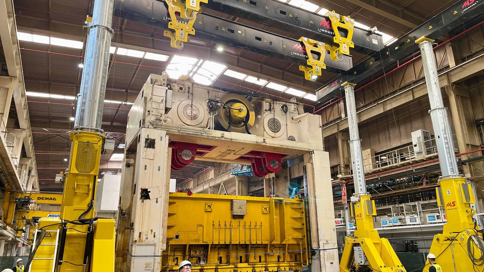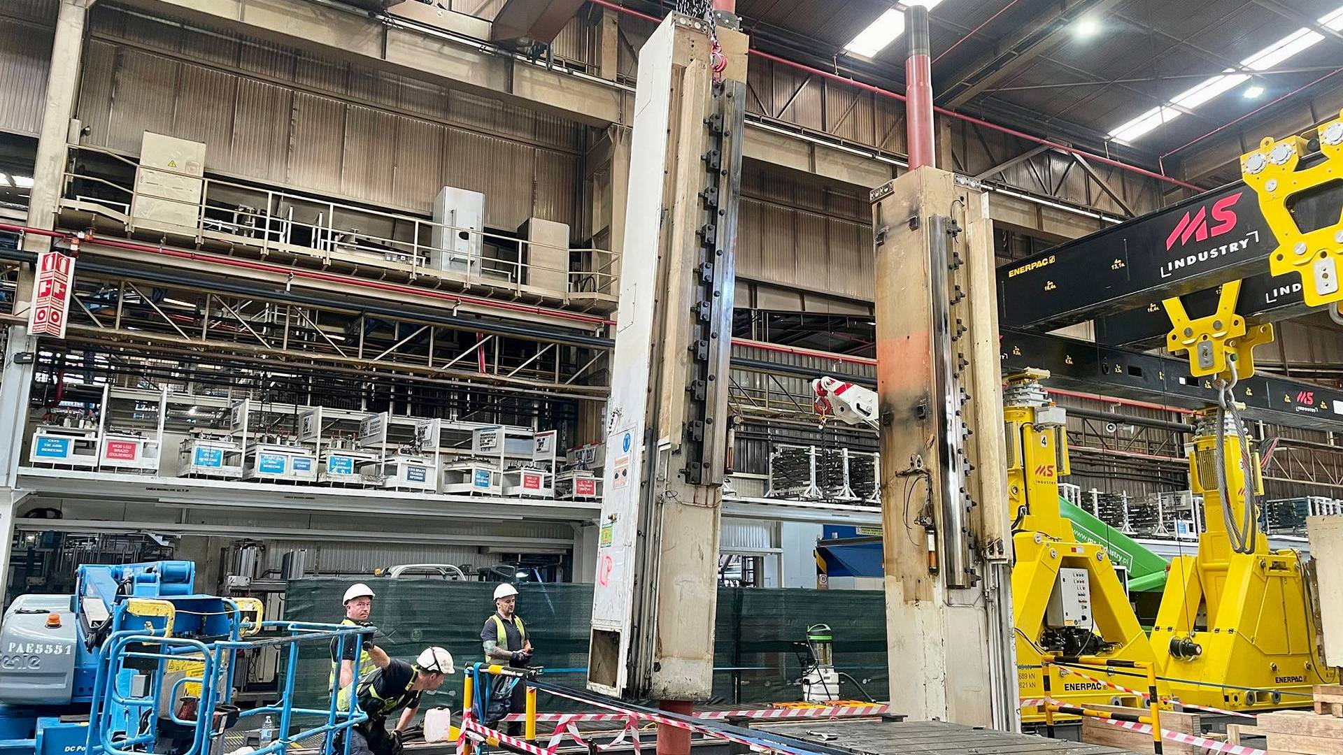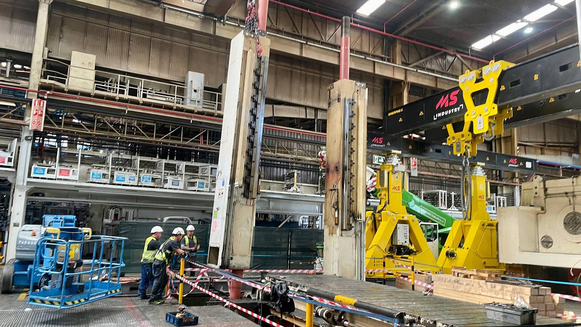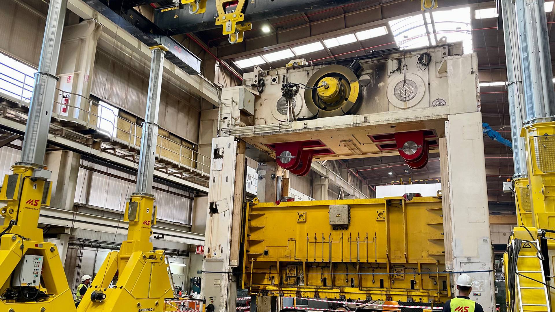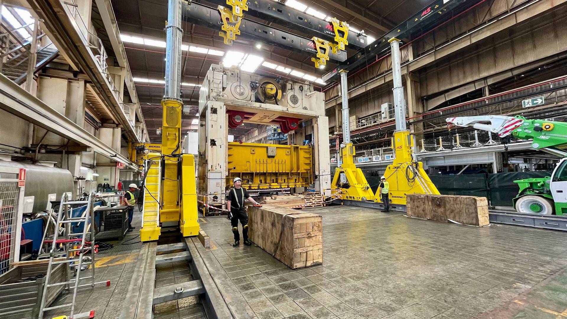 Demontaz prasy Fagor 2000 ton z wykorzystaniem systemu bramowego Enerpac w hali przemyslowej.